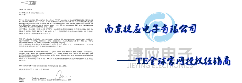 南京捷應(yīng)電子有限公司是國(guó)際無(wú)源器件品牌美國(guó)泰科電子(TE)在中國(guó)華東地區(qū)的主要通路商,代理經(jīng)銷旗下全系列產(chǎn)品包括TYCO(AMP)系列連接器、接插件、OEG、SCHRACK、P&B功率繼電器、美國(guó)RACHEM各類航空導(dǎo)線、熱縮套管、模縮套、標(biāo)識(shí)產(chǎn)品、電線電纜。